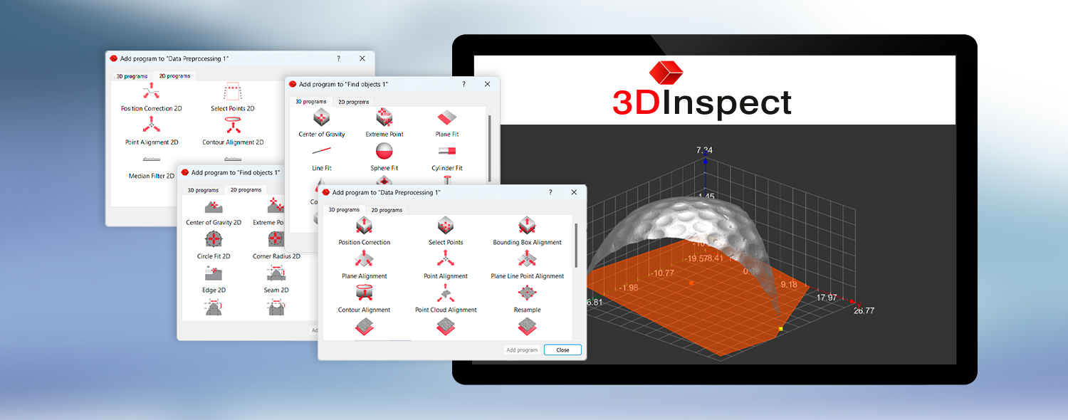 3DInspectは、マイクロエプシロンの3Dセンサ全種類に対応した、ユーザーフレンドリーな統一ソフトウェアツールです。3Dセンサのパラメータ設定と測定データの取得は、3DInspectソフトウェアから直接行うことができ、強力なツールにより、点群のアライメントやフィルタリング、関連領域の直感的な検出と選択、プログラムの組み合わせが行えます。3D点群はさらなる処理を行ったり、検出された測定値をコントローラに出力することができます。