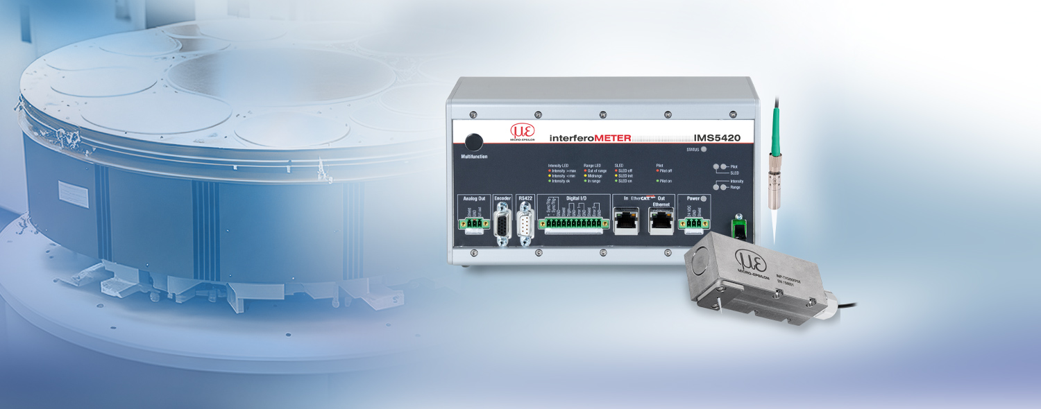 IMS5420は、単結晶シリコンウェーハの非接触式厚さ測定に対応した高性能な白色光干渉計です。コントローラには波長範囲が1,100 nmのスーパールミネッセントダイオード(SLED)が搭載されており、たった1つの測定システムと1 nm未満の信号安定性をもとに、非ドープ、ドープ、高ドープのシリコンウェーハの厚さを測定することができます。IMS5420は用途に応じて、オフセット距離の大きいセンサとフリーブロー装置付きセンサをご用意しています。