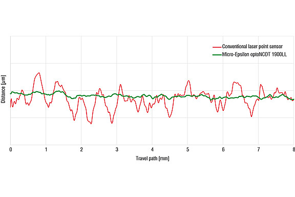 "このような要求に対応するには、光点が幅数ミリで楕円形のレーザーセンサを推奨いたします。この光点の形は細いレーザーラインに似ており、また表面の粗さや欠損、凹みあるいは微細な穴による障害も、楕円形の光点と特殊なソフトウェアアルゴリズムでフィルタリングされます。さらに、この種類のセンサは構造化された表面の測定、つまり表面の構造ではなく表面への距離を検知しなければならない場合での距離測定に適しており、楕円形の光点は表面の構造に影響されることなく、一定かつ安定した測定値を生成します。
