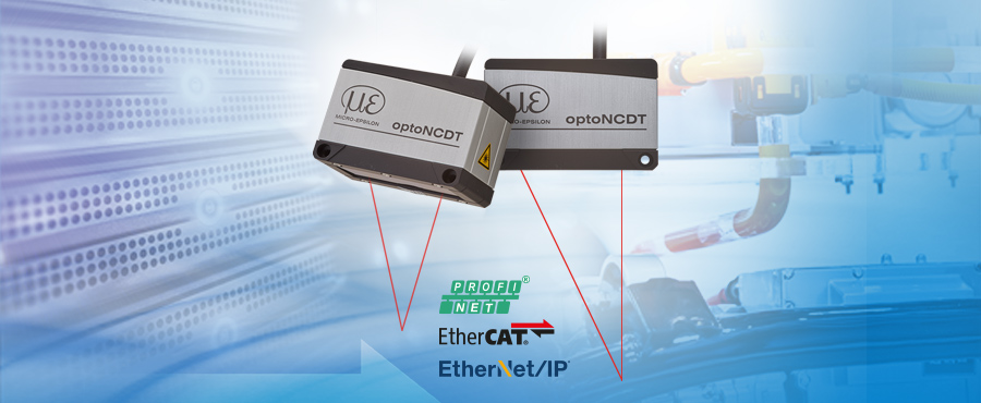 コントローラへの柔軟な接続ができるように、optoNCDT 1900センサにはEtherCAT、EtherNet/IP、PROFINETの各インターフェースが内蔵されています。産業用Ethernetインターフェース内蔵なので、高速プロセスや複数のデバイスや機械をネットワーク化する際に特に有利です。