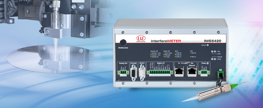 半導体製造プロセスでは最高の精度が要求されます。ウェーハの研削・研磨の工程では、高精度な平坦度と厚さが重要です。IMS5420は、研削・研磨工程にてインラインでウェーハの厚さ測定を非接触かつ連続で行うために開発されました。保護等級IP67に適合したステンレス製の小型センサ、アクティブ温度制御を搭載し高い安定性を実現するコントローラならびにセンサとコントローラを接続する光ファイバーケーブルで構成されます。