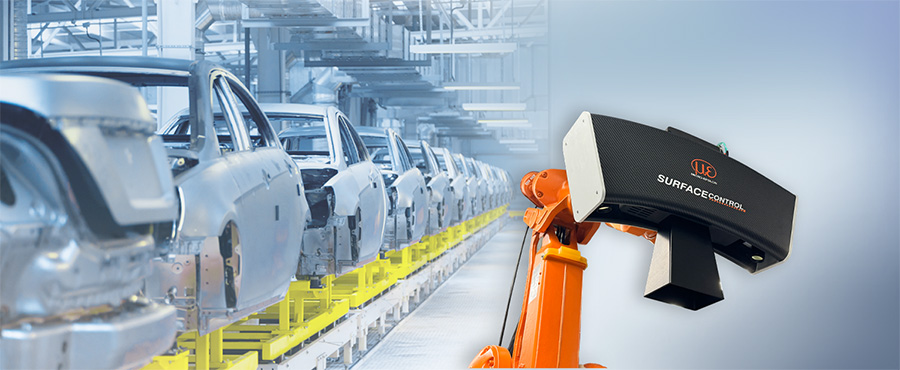 surfaceCONTROL Automotiveは、自動車産業においてボディシェルの塗装欠陥を完全自動で検出するためのロボットベースの測定システムです。拡散反射面では、縞投影の画像認識技術を利用したカメラによって検出されます。塗装面の凹凸、異物、傷など局所的な形状誤差は、学習プロセスを用いて高い精度と繰り返し性で検出することができます。